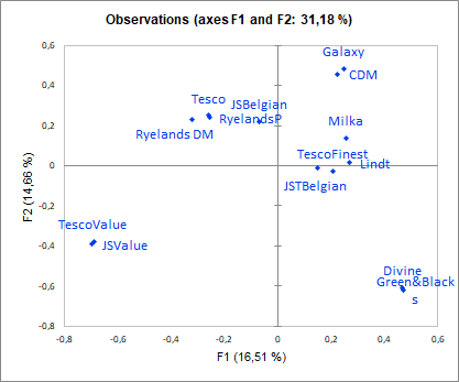 グラフは、審査員が全体でチョコレートの5個のグループを発見したことを示しています。さらに、DivineとGreen&Blacks からなるグループ、およびJSValueとTescoValue を含むグループは、他からまったく異なることが明らかです。