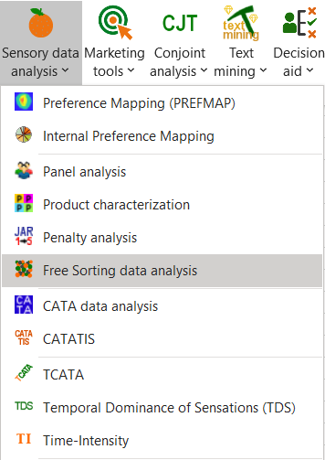 XLSTAT / 高度な機能 / 官能データ分析 / フリーソーティング・データ分析 機能(下図)を選択してください。