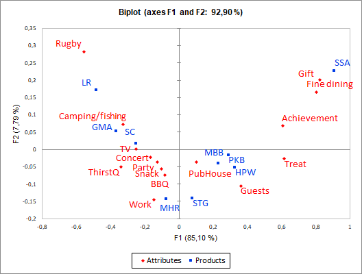 CATATIS の結果の最も重要な結果の1つは、製品と属性のグラフィカル表現です。以下のグラフで、最初の2軸でレポートされる92.90% のイナーシャがあることがわかり、我々はこれらの2つに満足できます。グラフは、お祝いを必要とする文脈(高級レストラン、達成...)とカジュアルな文脈(釣り、ラグビー...)の対比を示しています。したがって、LRビールはむしろカジュアルなビールと見なされ、SSAはお祝いのビールと見なされます。