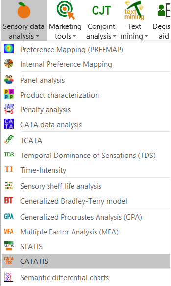 XLSTAT / 高度な機能/ 官能データ分析/ CATATIS コマンド(下図)を選択してください。