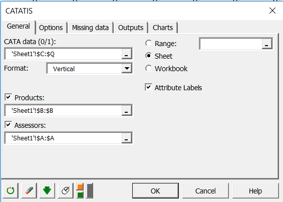 そして一般タブで、CATA データ(融合されたすべてのデータ)を選択できます。形式は、データがどのように融合されているか、水平または垂直を示します。形式が水平であれば審査員の数を指定し、垂直であれば製品と審査員が必須です。