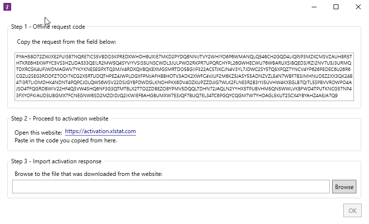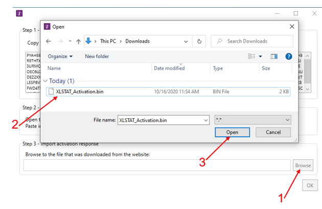 ステップ 4: アクティベーション・ウィンドウに戻って、ブラウズをクリックしてください。XLSTAT_Activation.bin file があるディレクトリに行って、そのファイルを選択してください。そして開くをクリックしてください。