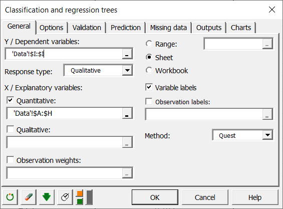 XLSTATでのQUEST分類木を生成するダイアログ・ボックスのセットアップ