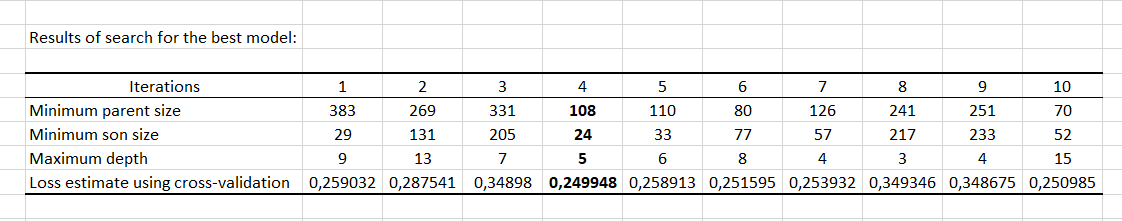 我々のアルゴリズムの4番目の反復で、最適なパラメータがあることがわかります: - 最小親サイズ: 108