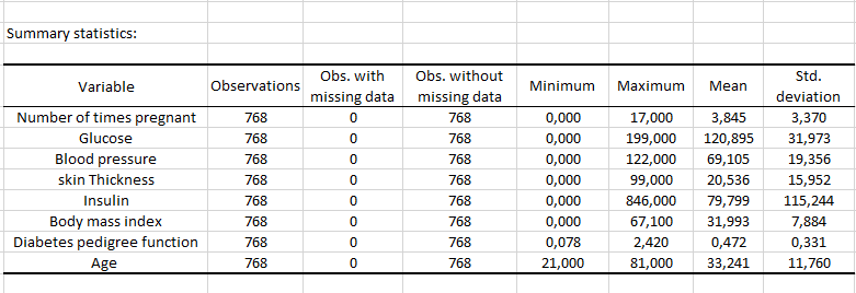 このデータセットの出処は、National Institute of Diabetes and Digestive and Kidney Diseasesです。チュートリアルの目的は、データセットに含まれる測定値に基づいて、患者が糖尿病であるか否かを診断的に予測することです。とくに、ここでの患者はすべてピマ・インディアンの血を受け継ぐ21歳以上の女性です。 データセットは、複数の医学的予測(独立)変数と1個の目的(従属)変数、アウトカム(結果)からなります。独立変数には、患者の妊娠経験回数、BMI、インスリンレベル、年齢などが含まれます。
