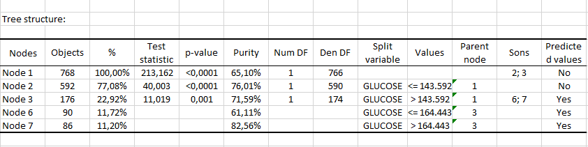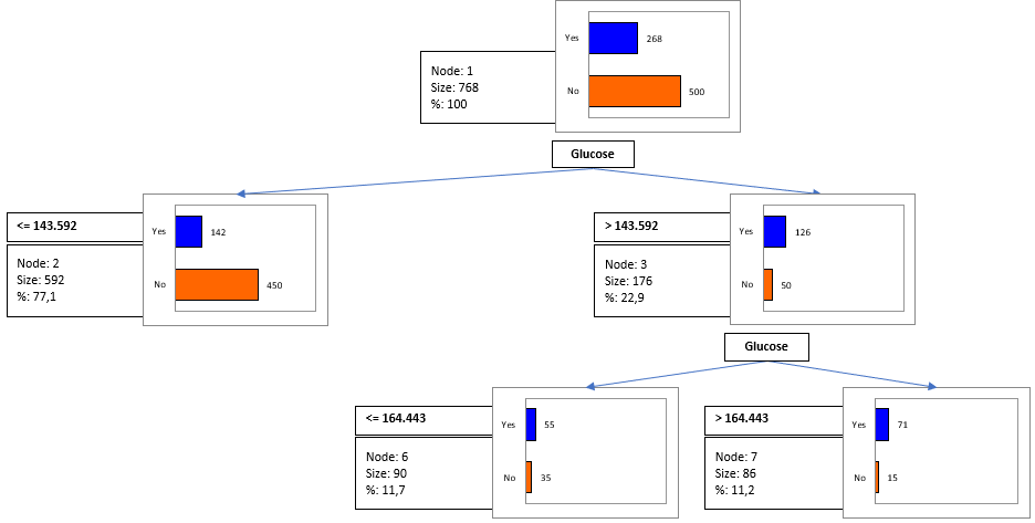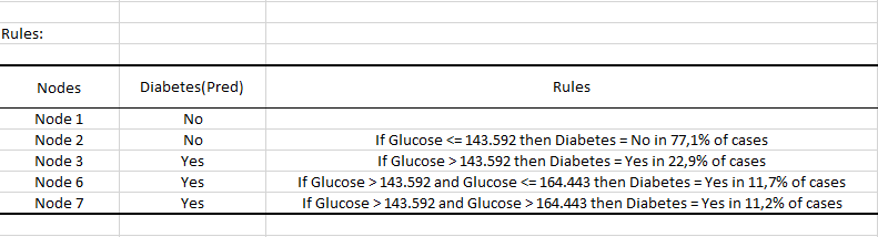 この方法で、 "If Glucose <= 143.592 then Diabetes = No in 77,1% of cases" であることがわかり、このルールは、木構造の表でわかるように、純度76.01のノードにより、592個のオブザベーション(データセットの77%)により検証されます。