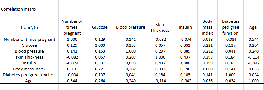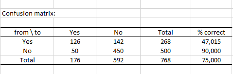 すべての変数の要約統計と相関行列が最初に表示されて、オブザベーションの再分類を要約する混同行列が続きます。後者は、正しく分類されたオブザベーションの%を素早く見ることができます。それは、オブザベーションの合計数での正しく分類されたオブザベーションの比率です。ここでは、それが75,0%に等しいです。