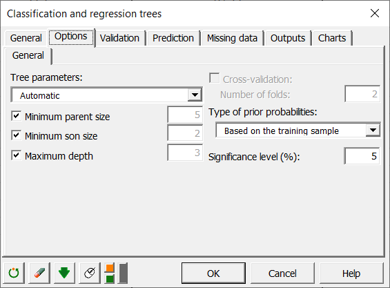 オプション/一般 タブで、モデルの最適パラメータを見つけるために自動を選びます いくつかの技術的なオプションにより、ツリーの構築方法をより適切に制御できます。