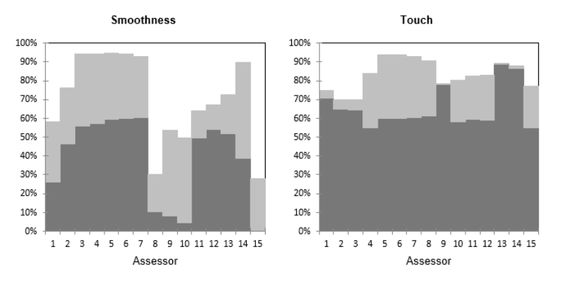 下記のグラフは、各対(審査員、ディスクリプタ)について、PCAプロットが負う分散の%を示します。濃い灰色のところは、第1軸が負う分散の%で、薄い灰色のところは第2軸が負う分散の%です。 smoothnessでは、2番目の軸により関係しているが、悪く表現されている審査員(8,9,10)と は異なる審査員のグループがあることがわかります。また、Elasticity と Closing は似ていて、第2軸に負荷があることを確認できます。