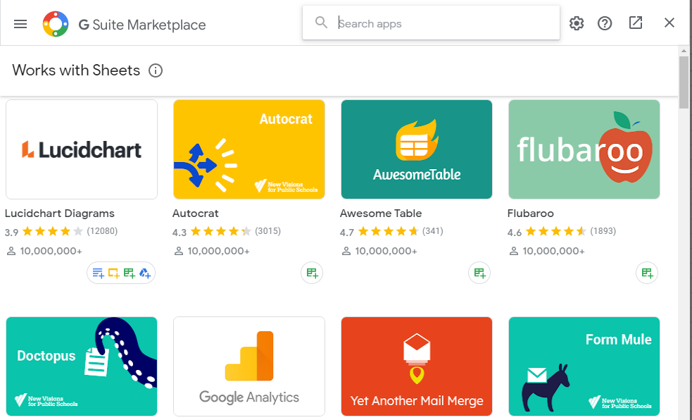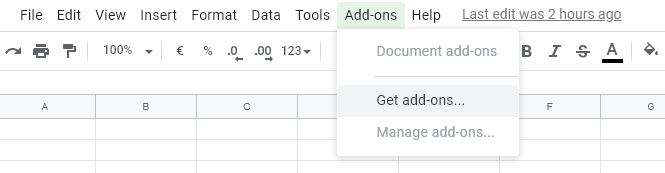 スプレッドシートを作成したら、アドオン> アドオンを取得をクリックしてください。この動作の目的は、Google アドオン・カタログを開くことです。