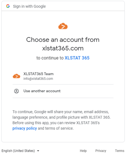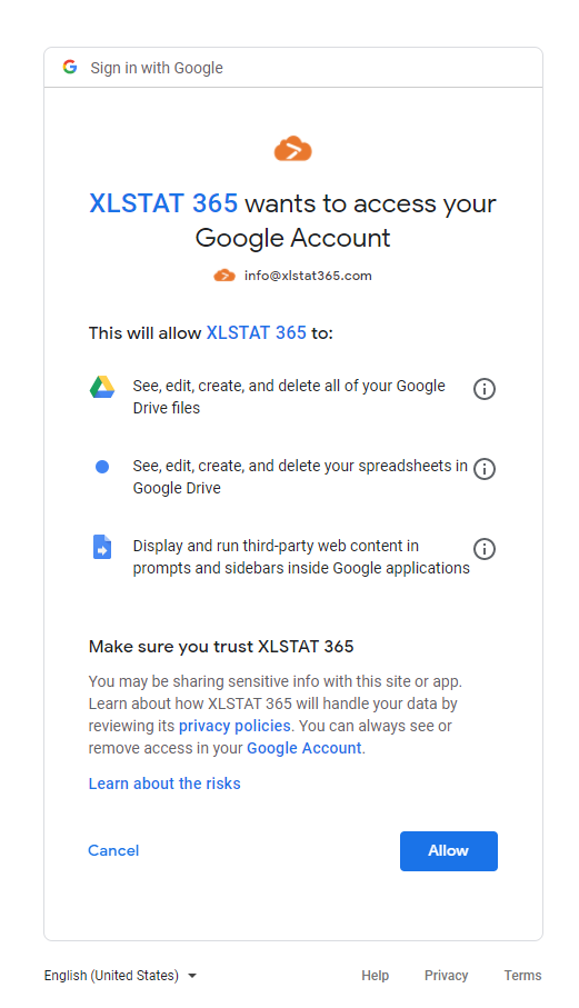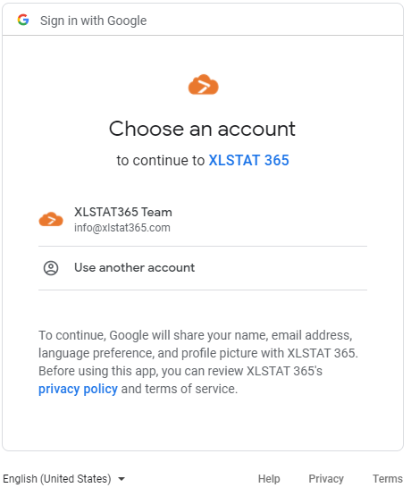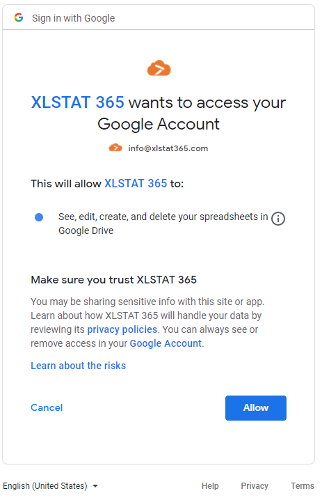 アカウントを選択すると、続くウィンドウが現れて、XLSTAT 365 があなたのGoogleアカウントに持っているアクセスを提供します。