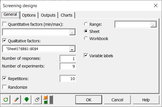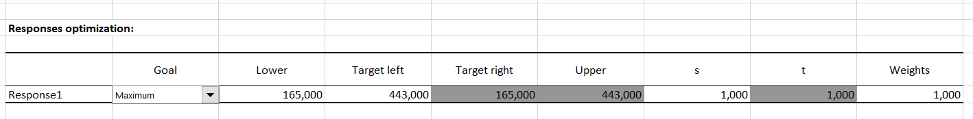 オプションタブでは、応答最適化オプションにチェックを入れて、design シートの関連する表を選択してください。