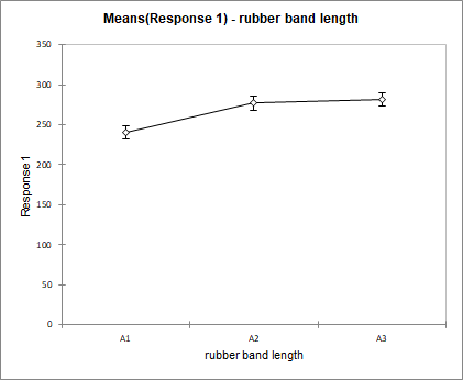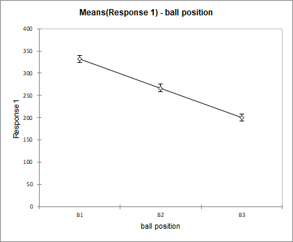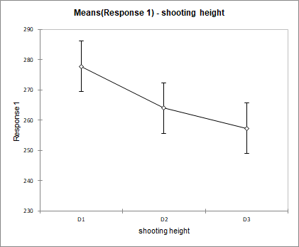 これらのチャートは、発射体の発射距離に対する各因子の効果を示しています。任意の因子について、その各カテゴリの平均距離が表示され、線で結ばれます。最も高い分散を持つ因子が最も大きい効果を持ちます。この事例では、それはB1の331とB3の200の間で距離が変化する因子 ball positionです。最も小さい効果は、 因子 shooting height でD1で277およびD3で257です。カテゴリのそれぞれでの反復測定を用いて、平均信頼区間を計算できます。