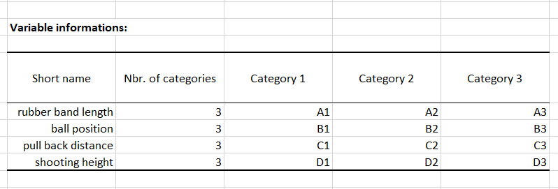 ここでの目標は、カタパルトによって発射された発射体が送られる距離に影響を与える4つの因子を分析することです。これらの因子は: rubber band length=ラバーバンドの長さ (A1, A2, A3)、ball position=ボール位置 (B1, B2, B3)、pull back distance =引き戻し距離(C1, C2, C3)、shooting height=射撃高さ (D1 , D2, D3)です。計画が生成されてから、射撃距離が追跡されました。そして、我々の目的は各因子の効果を調査することです。