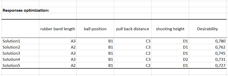 総括すると、shooting height 因子は他の因子と比べて低い影響度を持ち、分析から除外できます。最適な位置を見つけるために、ball position 因子をより詳細に分析する必要があります。これは、たとえば、応答曲面実験計画で、他の2つの要素、rubber band lengthと pull back distanceと一緒に行うことができます。