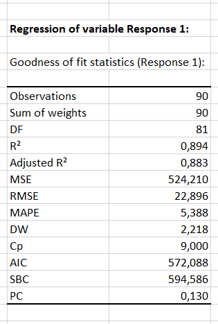 そして、適合度係数で始まり分散分析のすべての結果が表示されます。R² = 0.894で、ANOVAがデータをとてもよく記述していることを示してします。