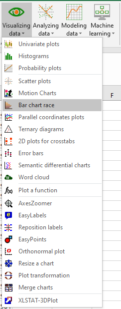 下図のように、XLSTAT/ データ可視化 / 棒グラフ・レース 機能を選択してください:
