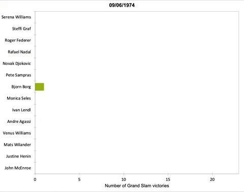 このチュートリアルの目的は、与えられた期間 (1970-2019)で時間的な動的なグラフにより、グランドスラム勝者の推移を示すことです。