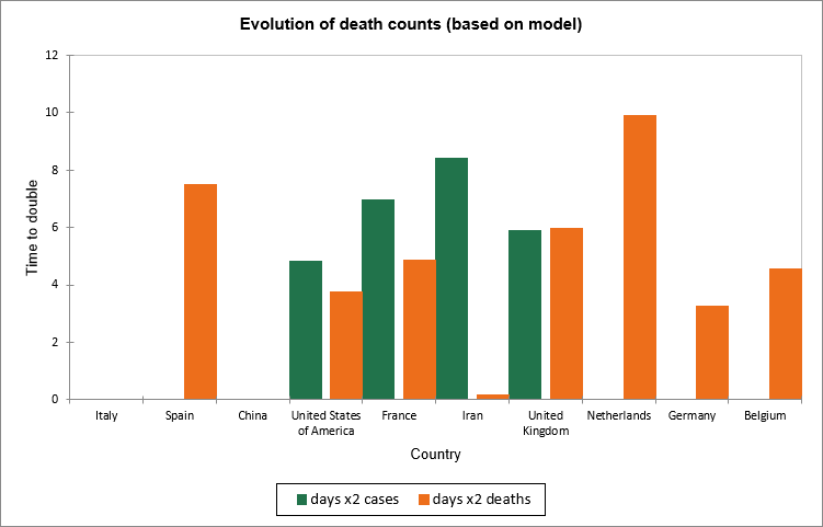 この表の後には、症例数や死亡数が2倍になると予想されるまでの日数を比較するグラフが続きます。 その数が10を超える場合、または計算できなかった場合、その数は表示されません。