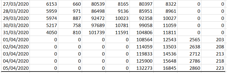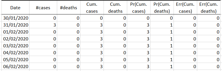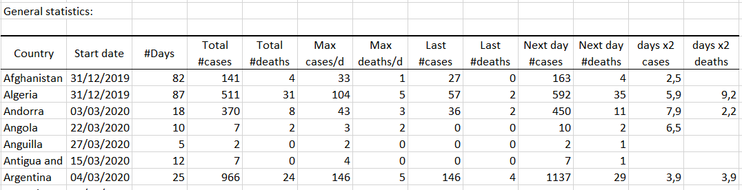 開始日の後(2019年にすでに報告されている国では正確ではありません)、最初の症例からの日数、症例の総数、総死者数、最大症例数が表示されます 1日あたりの1日あたりの最大死者数、最後の症例数、最後の死者数、次の日付の予測症例数、次の日の予測死者数、その前に予測された日数 症例数は2倍になり、死亡者数も同じです。
