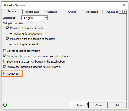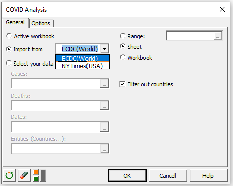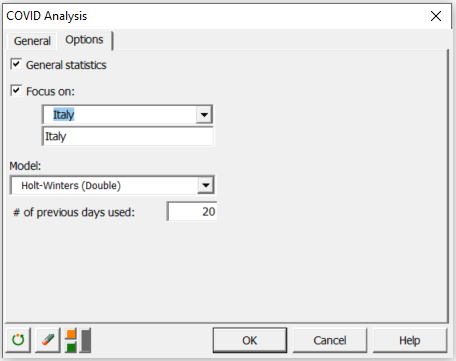 ダイアログ・ボックスのオプションタブで、いくつかの追加のオプションがあります。1つには、注目したい国(またはエンティティ)を選択できます。これにより、発生の開始から今日までのXLSTATモデル(以下を参照)の予測を確認できます。