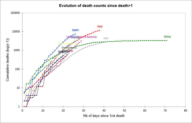 XLSTATは、死亡数が2を超えてからの各国の軌跡を示すグラフを表示します。y軸の目盛りは対数です。 各国の状況を比較できます。