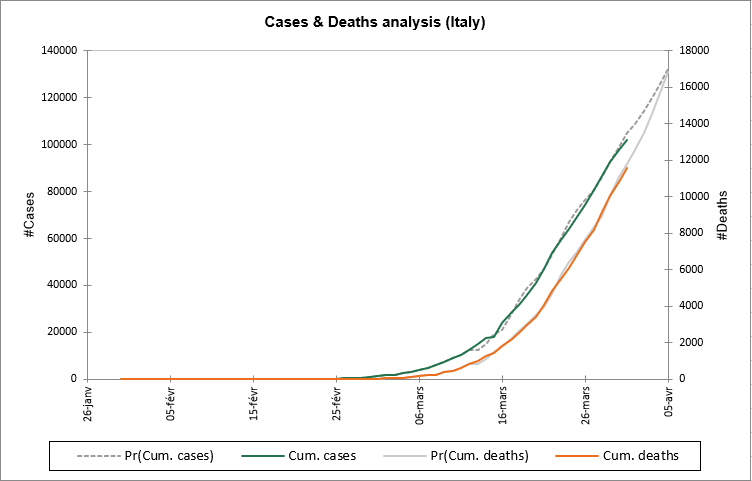 最後のグラフには、症例と死亡の両方のデータとモデル予測が表示されます。