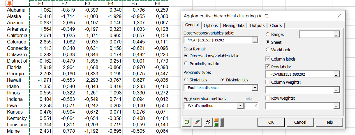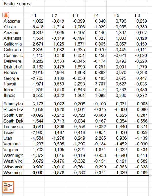 因子得点の表の下にあるボタンをクリックして、AHCを起動することもできます。オレンジ色の矢印は、多数の変数がある場合に、表の最後にダイレクトに行くことを可能にします。
