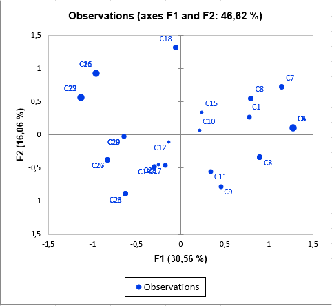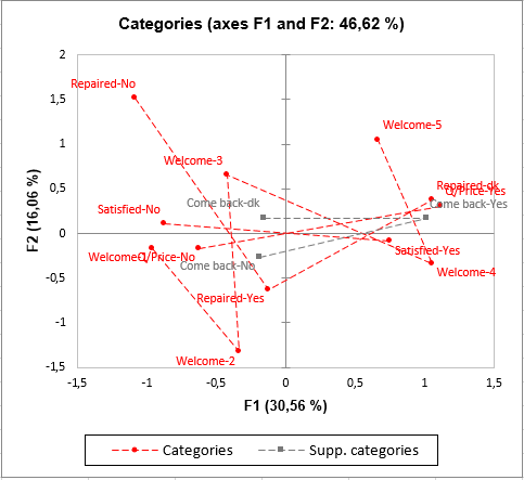 寄与率、テスト値、2乗cosが、結果の解釈を助けます。マップ上で2つのカテゴリが近くても、解釈する前に、それらのマップの軸への寄与率を確認するか、それらの2乗cosが高いことを確認するべきです。