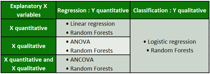 下の表は、予測する変数Yの性質と説明変数Xの性質に応じて、Easy Fit 関数で現在利用可能な複数の予測モデルを示します: