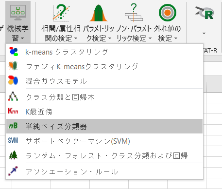 XLSTATを起動すると、XLSTAT / 機械学習 / 単純ベイズ分類器 コマンドを選択してください。