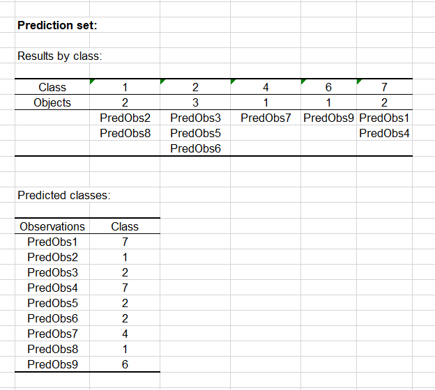 最初の表では、結果はクラスごとに与えられており、2番目の表では各オブザベーションごとに与えられています。PredObs4 とラベルされたオブザベーションは、type 7のクラスに分類されていることがわかります。
