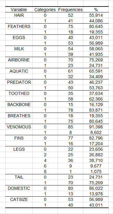 最初の表で、動物のtype 1 クラスが、41.935%でトレーニング・データセット内で最も度数の多いそれであることがわかります。 下記の次の表では、我々は、トレーニング・セットでは、 5 legged (5本足の)動物の例はなかったことがわかります。