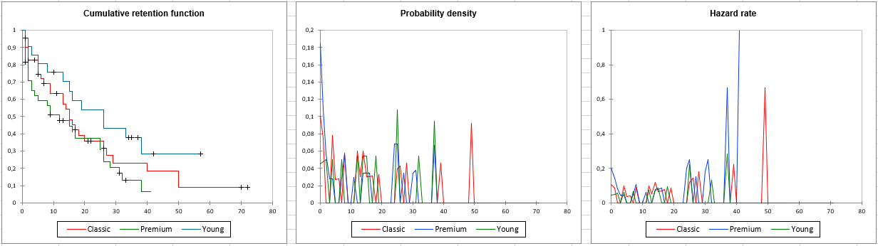最後に、さまざまなセグメントでの維持、密度、ハザード曲線を比較するチャートが生成されます。