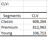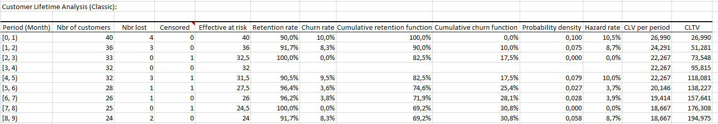 最後の2列は、CLV (顧客生涯価値: customer lifetime value) および CLTVの推定値を表示します。サブスクリプションから6か月でキャンセルするClassicセグメントの顧客は 、138,227€.の平均CLTVを持つことがわかります。