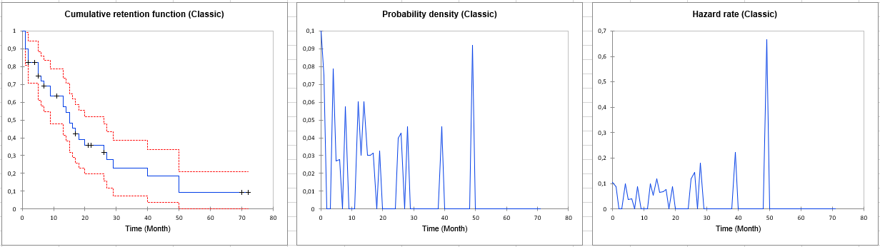 累積離反関数は、調査の開始からの失われた呼格の割合を提供します。Classic セグメント、より具体的には、サブスクリプションの6か月後である期間 [5.6] に注目しましょう。累積離反関数の値は 25.4%です。これは、サブスクリプションから最初の6か月以内に、顧客の1/4がサブスクリプションをキャンセルしていることを意味します。