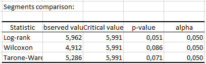 続く出力も、我々がセグメントの比較オプションを選択したので表示されるものです。これは3種類の検定の結果を格納します: Log-rank 検定、Wilcoxon検定、Tarone Ware 検定。これらの検定は、カイ2乗検定に基づきます。p値が低いほど、セグメント間の差がより有意です。