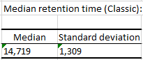 中央値維持時間と関連する標準偏差が続きます。classicセグメントでは、 顧客の半数が15 か月後に失われます (14,719)。