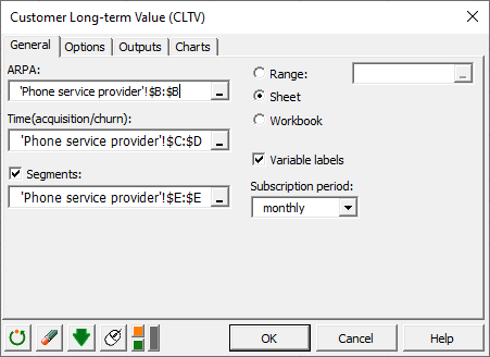 一般タブで、ARPA (Average Revenue Per Account:アカウントあたりの平均収入) フィールドにサブスクリプション価格に対応する列を選択してください。そして、時間(獲得/離反)フィールドで獲得の日付と離反の日付に関係する2つの列を選択してください。我々のデータセットは、セグメンテーション変数を含んでいるので、 セグメントにチェックを入れて、XLSTAT がセグメントごとに結果を生成できるように、対応するデータを選択してください。