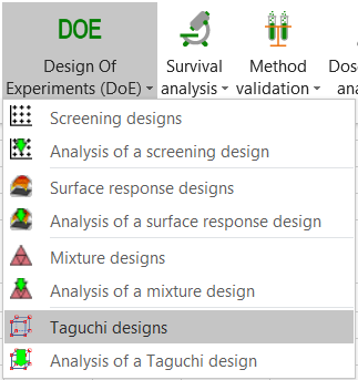 XLSTATを起動すると、DOE アイコンをクリックしてタグチ計画機能を選んでください。