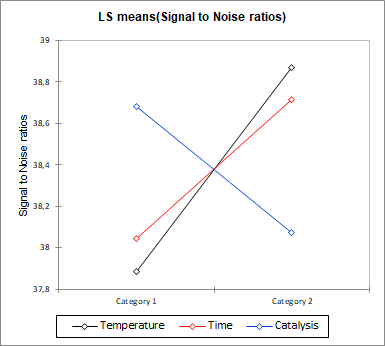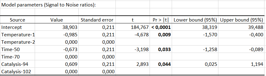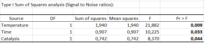 興味深い最初の出力は、信号対ノイズ比(SN比)の表です。SN比は、製品のロバスト性を改善でき、したがって、その目的はそれを最大化することです。SN比が高いほど、製品がよりロバスト(頑健)になります。