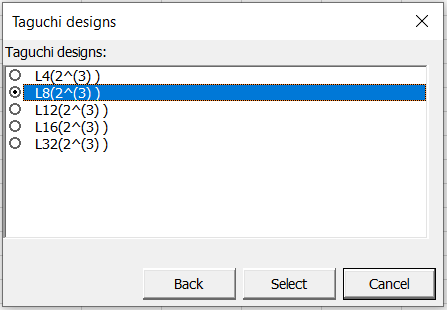 提案されたタグチ計画とともに2番目のダイアログ・ボックスがポップアップします。8とおりの実験を使用するL8 計画を選択します。