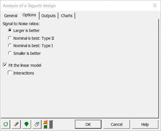 ここで、我々は亜鉛のパーセンテージを最大化したいので、信号対ノイズ比(SN比) "望大(大きいほど良い)"を選びます。また線形モデルの調整も選びます。