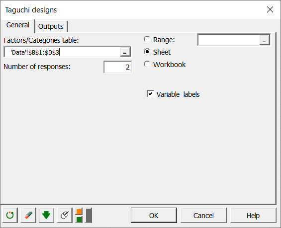 結果は複数のシートに分割されます: 1. Data: このシートは選択された要因を格納します。 2. Taguchi design: このシートはタグチ計画と応答を格納します。 3. Taguchi analysis: このシートは、タグチの分析の結果を格納します。