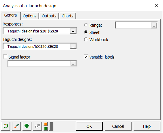 タグチ計画が完成すると、この表のすぐ下にある「分析を実行する」ボタンをクリックできます。これで、事前に記入されたダイアログ・ボックスが自動で起動します。または、DOE アイコンをクリックして、タグチ計画の分析機能を選んで、データを読み込むこともできます。