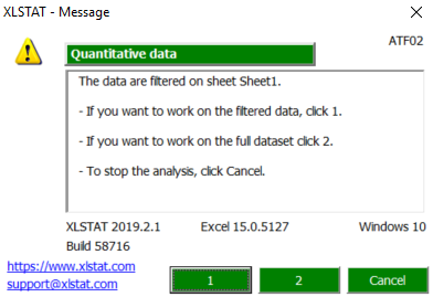 注意: フィルタされたデータを分析する能力は、現在、ほとんどの主要なXLSTAT 機能 (たとえば、ANOVA、ヒストグラム、正規性検定、PCAなど)プラス、いくつかの高度な機能 (たとえば、コンジョイント分析、Mann-Kendall、ランダム・フォレストなど)で利用可能です。