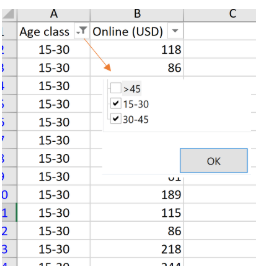 列ヘッダに矢印が現れます。 Age classの横の矢印をクリックしてください。特定の年齢グループを選択外にするために、 >45 の横のチェック・ボックスをクリックしてください。そして、OKをクリックしてください。