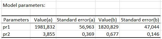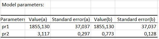 次の表は、各グループでの修正後のモデル・パラメータを詳細に提供します。グループ "a" とグループ "b" の最大速度に対応するpr1がかなり近いことがわかります。