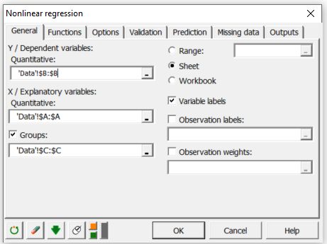 非線形回帰ダイアログ・ボックスがポップアップします。Excelシートでデータを選択してください。