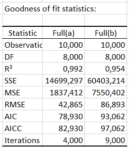 最初の表は、従属変数と説明変数の基本的な統計量を提供します。2番目の表(下図)は、 R² (決定係数)、および SSE (誤差平方和)を含む適合度係数を表示します。後者は、モデルの最適化に使用される基準です。R² は説明変数 (the time)によって説明された従属変数(the dry weight) の変動の%と一致します。R²が1に近いほど、より良い適合です。
